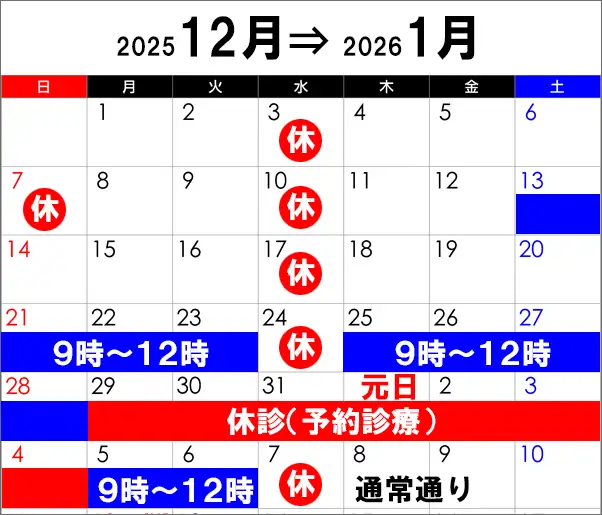 2025年11月28日 / 最終更新日 : 2025年11月29日 wasedaah お知らせ 【2025】年末年始の診療日程 休診 12/7(日) 12/9(月)~1/4(日) 午後休診 12/13(土) 12/21(月)~28(日)1/5~6 ※水曜は定休
